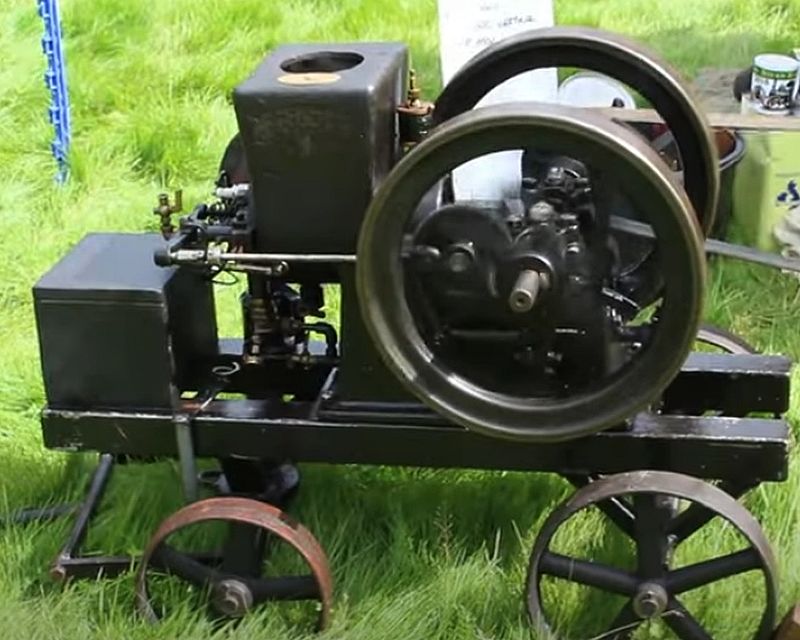 Ces ensembles moteurs se composaient d’un chariot surbaissé, plus ou moins sophistiqué selon les distances et la difficulté du déplacement, et d’un monocylindre le plus souvent vertical comme le montre le modèle jouet de la photo suivante. La chaudière était verticale à peu près sans exception.