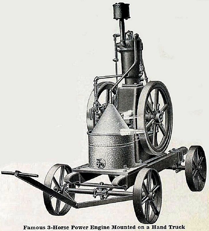 Les moteurs les plus utilisés en petites puissance, moins de 5 CV, étaient massivement du type ‘Hit’n miss’ . Le refroidissement par évaporateur était directement intégré au moteur pour les plus petits moteurs mais séparés dès que la puissance devenait plus élevée. On en voit 3 exemples typiques sur les illustrations qui suivent. Les chariots étaient de facture simple, tournés vers l’efficacité brute, l’économie et la durabilité.