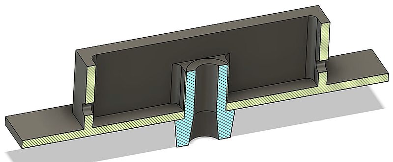 Le pivot est soudé à l’étain sur la traverse après que tous les perçages et défonçages ont été faits. On voit ci-après une coupe qui présente l’assemblage. La suite présente la séquence d’usinage retenue.