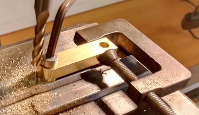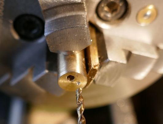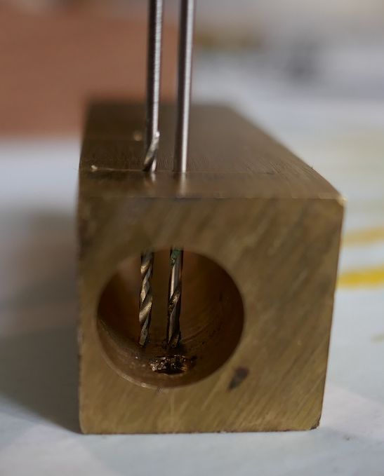 Le perçage des deux canaux vapeur a été réalisé dans un mandrin 3 mors, avec une petite cale. Une très grande précision n'est pas nécessaire et le 2ème canal n'a pas besoin d'être à 180°.