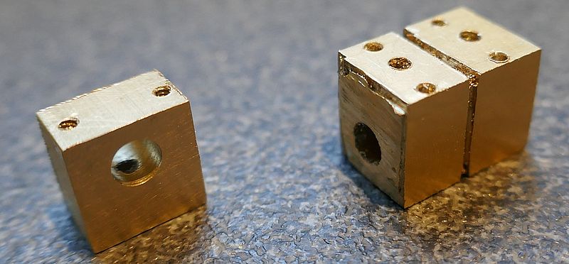 Pour la grosse extrémité du cylindre (la culasse), et compte tenu des dimensions du cylindre, je suis parti d'un carré de laiton de 14 mm, percé et alésé à 8 mm, puis tronçonné en 3. Reprise au tour dans une bague, pour réaliser un épaulement de 2,5 mm, puis le perçage de l'orifice vapeur de 1 mm. Fraisage final pour obtenir des côtés de 11,5 mm.