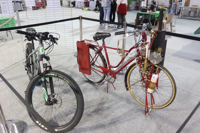 Vélo d'hier et d'aujourd'hui et le stand du CMCF de Oignies avec une machine vapeur en 5"