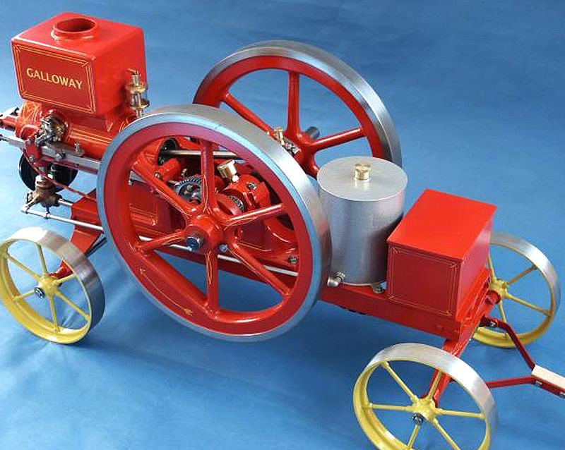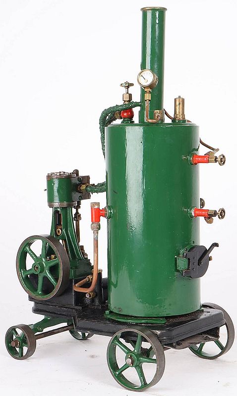 Ces ensembles moteurs se composaient d’un chariot surbaissé, plus ou moins sophistiqué selon les distances et la difficulté du déplacement, et d’un monocylindre le plus souvent vertical comme le montre le modèle jouet de la photo suivante. La chaudière était verticale à peu près sans exception.
