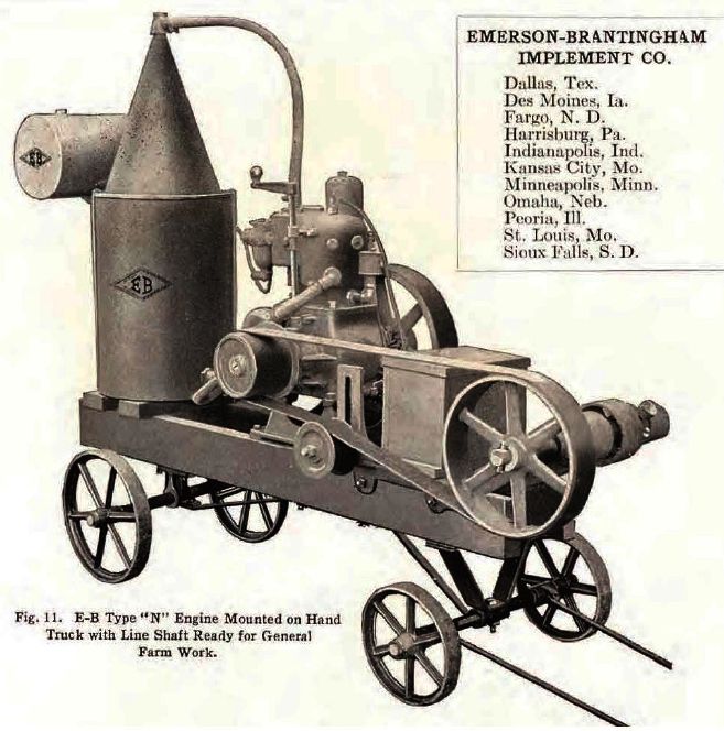 Les moteurs les plus utilisés en petites puissance, moins de 5 CV, étaient massivement du type ‘Hit’n miss’ . Le refroidissement par évaporateur était directement intégré au moteur pour les plus petits moteurs mais séparés dès que la puissance devenait plus élevée. On en voit 3 exemples typiques sur les illustrations qui suivent. Les chariots étaient de facture simple, tournés vers l’efficacité brute, l’économie et la durabilité.