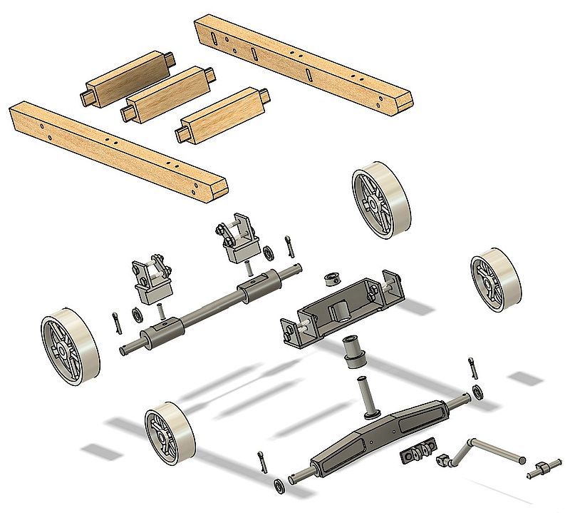 Comme le chariot ne sera soumis à aucun effort ni à aucune usure on pourra simplifier la conception et le montage : assemblage par soudure à l’étain et boulonnage. On utilisera de la pâte à étamer de plomberie pour la soudure à l’étain. Elle s’étale au pinceau et contient le dépacant/désoxydant en bonne proportion avec le métal en poudre. L’essieu arrière et la cheville ouvrière (traverse avant) demandent un peu d’attention et d’organisation des usinages.