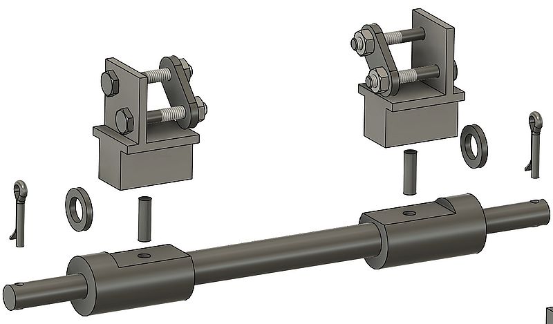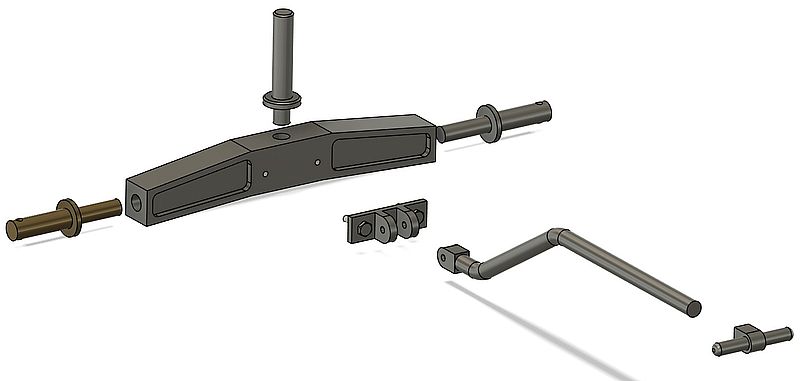 L’arbre d’essieu est monobloc. Il est tourné dans du rond de laiton en s’aidant de préférence d’une contre-pointe tournante car le rapport Longueur/Diamètre est grand. Reprendre en fraiseuse pour usiner les plats et réaliser tous les perçages.