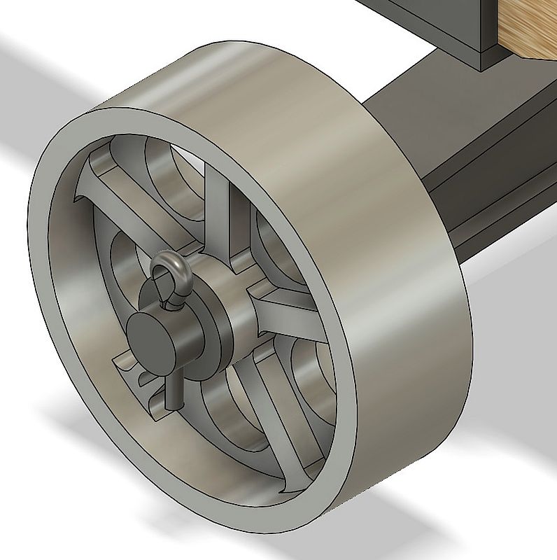 En général les roues étaient de simples pièces de fonderie dont la jante et le moyeu étaient reprise en tournage. Les roues de ce chariot modèle réduit sont un peu compliquées et surtout longues à fabriquer. Elles sont usinées sur fraiseuse avec un plateau tournant. Des roues de conception plus simples donnent un bon résultat esthétique pour autant que les dimensions soit bien adaptées. On peut les fabriquer en fonte ou en aluminium.