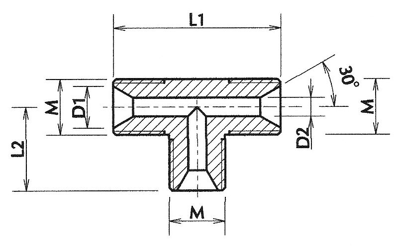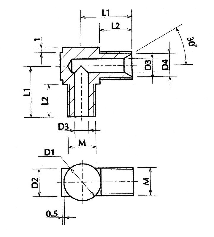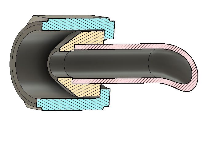 Ce raccord est assez peu utilisé, on le fabriquera au coup par coup. Il est surtout employé lorsque l’angle de sortie du tube doit être réglé en place, par exemple pour les pompes à eau ou à huile. Son usinage doit être soigné car il peut vite être fuyard. Par conception le serrage doit être puissant pour comprimer les rondelles d’étanchéité. Compte tenu de la circulation de l’écoulement il amène des pertes de charge importantes.