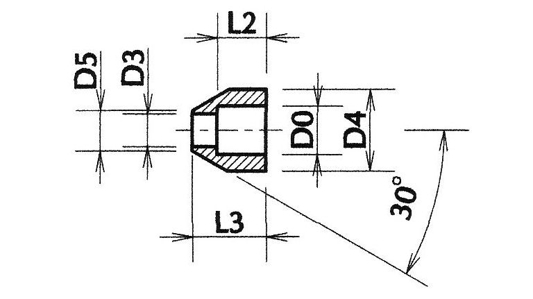 - 5. Perçage de trou borgne D0 sur profondeur P1. On utilise le plus souvent une fraise à coupe au centre pour obtenir un trou à fond plat. Usinage de l'épaulement D2 sur la profondeur E2 – E1. Ne pas négliger le rayon R1 qui améliore l'esthétique finale. Le rayon R1 pourra être usiné via un outil de forme meulé dans un barreau HSS ou plus simplement avec une lime ronde pour affûter les chaînes de tronçonneuses.