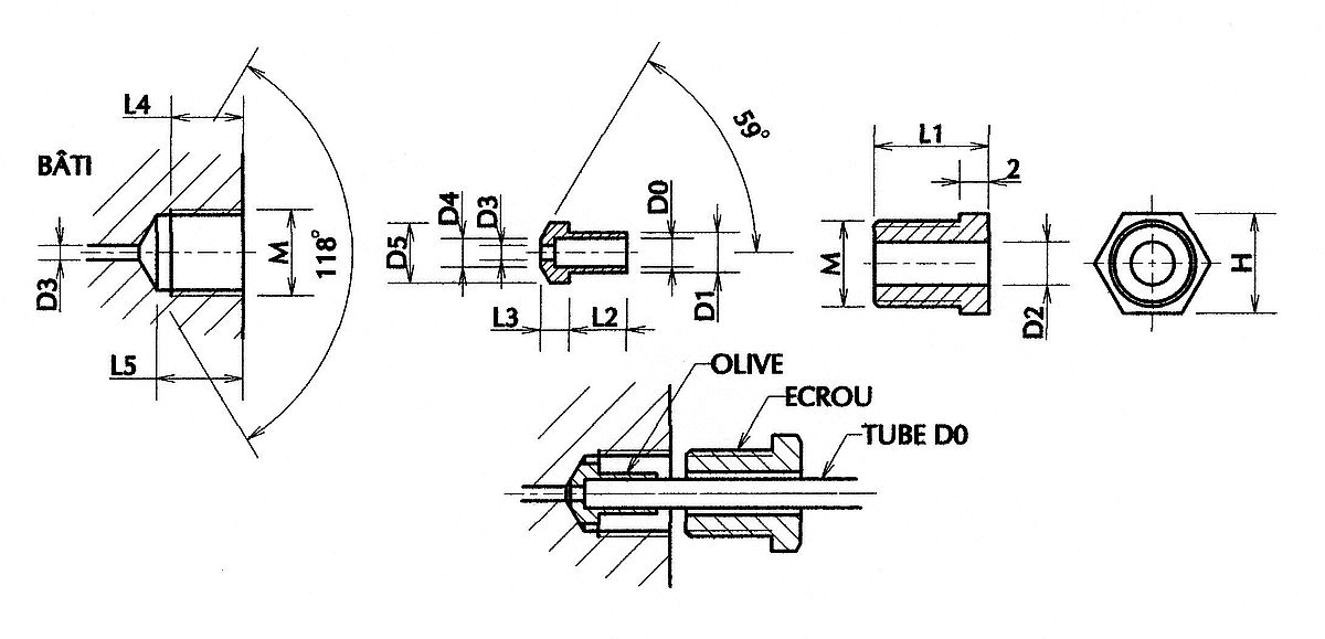 - Un écrou assurant la fixation de la tuyauterie sur le bâti et l'application de l'olive sur le cône de perçage du bâti.