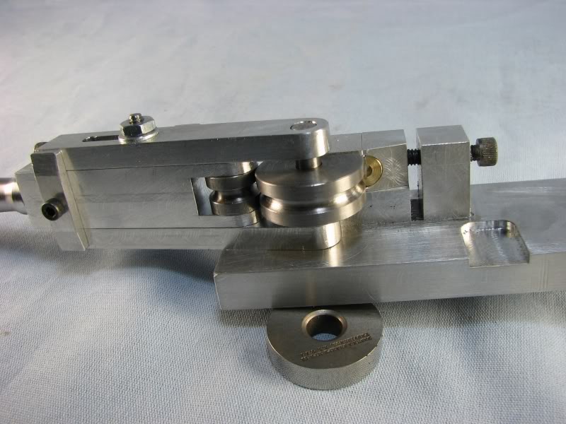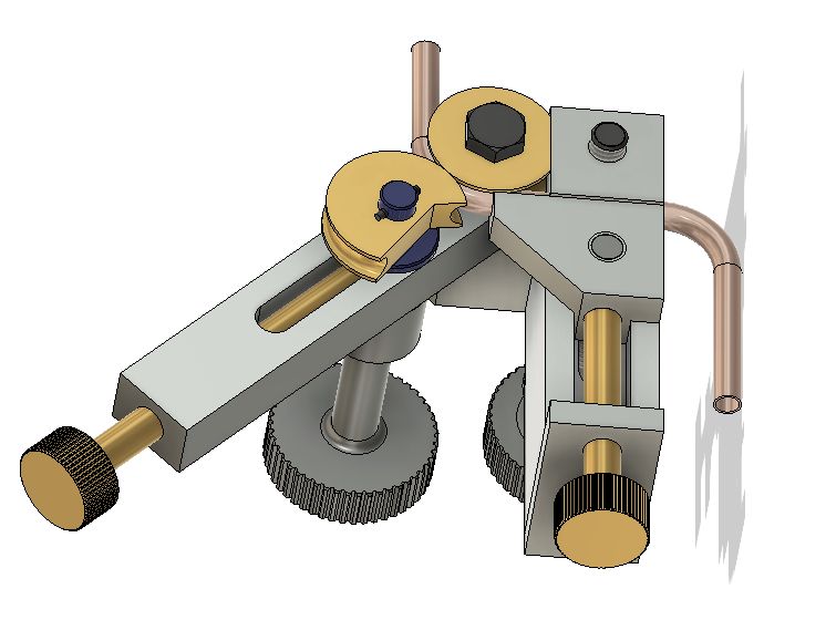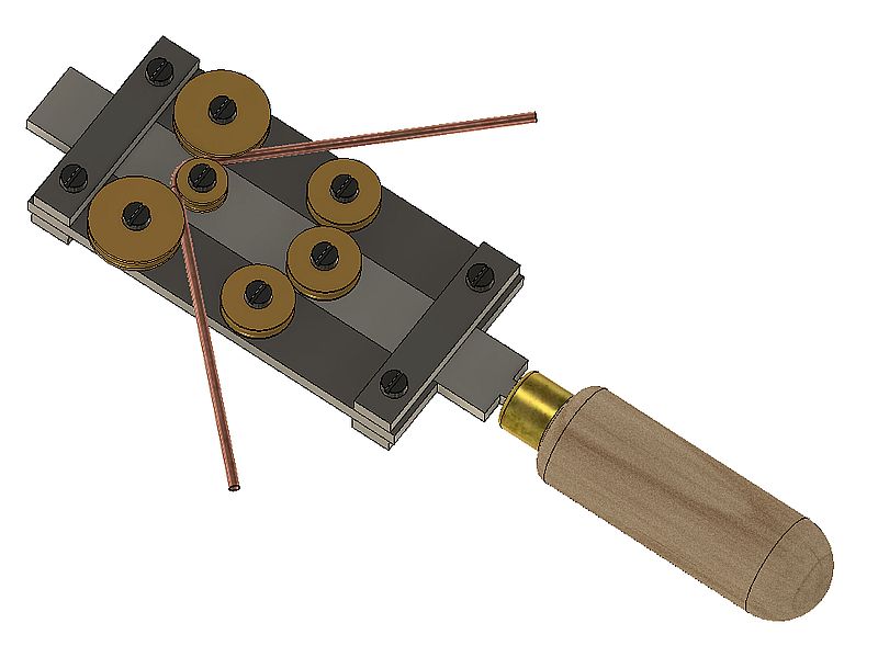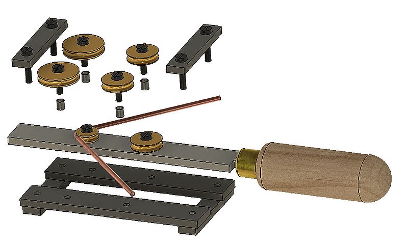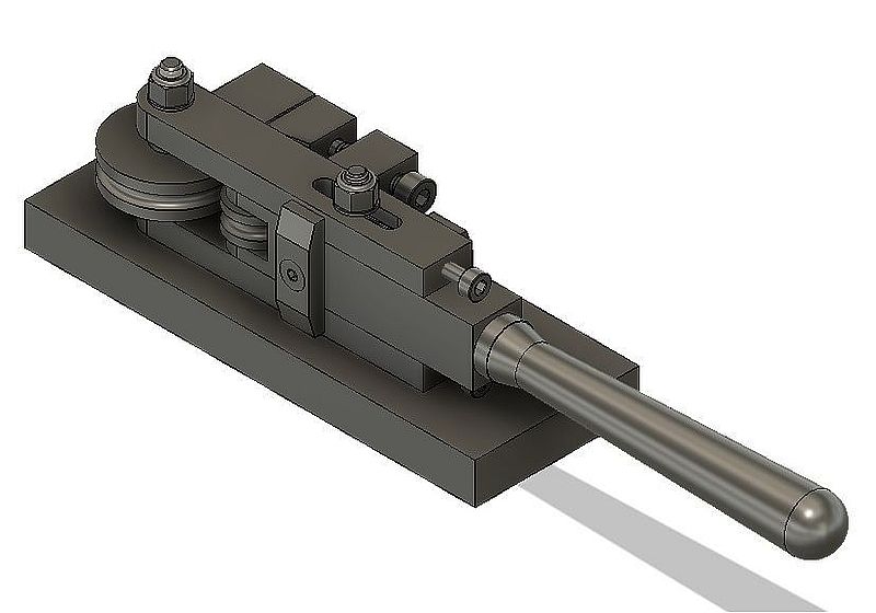Ci-dessous une cintreuse plus versatile dont le modèle original est dû au modéliste anglais Georges BRITNELL. Elle s’adapte à tout diamètre de tube extérieur entre D2 à D6 (théoriquement). Pour chaque diamètre de cintrage on aura un galet à usiner pour un diamètre de tube donné.