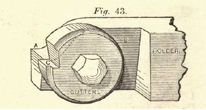 Ci-dessous un outil dit « à molette». C’est un outil de forme qui présente la particularité d’avoir un affûtage très simple et qui conserve son profil à chaque affûtage. On tourne la molette au fur et à mesure de son usure et de ses affûtages. Le profil de la molette s’exécute au tour et il est étudié pour que malgré l’angle de pente la coupe ait le profil exact. Cet outil était en acier trempé. Il pouvait se fabriquer et s’affûter dans l’atelier même, sans machines sophistiquées.