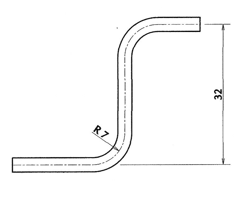 La cintreuse N°2 permet de maintenir le tube lors de l’opération. A noter que la cote de 32 mm est la valeur minimale obtenue avec cette cintreuse. Cette cintreuse a été étudiée pour un diamètre de tube de 3 mm avec un rayon de 7 mm mais couvre 95% de nos besoins sur nos modèles. Pour un autre rayon, il faudra revoir le mors et le galet fixe. Pour un autre diamètre de tube, revoir la conception de la cintreuse.