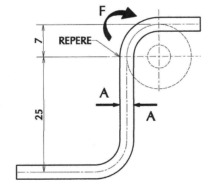 Dans la pratique on prend des diamètres de cintrage intérieur de 14 à 16 mm, ce qui assure un façonnage aisé et des galets faciles à fabriquer avec un axe et une bague d’usure rapportés.