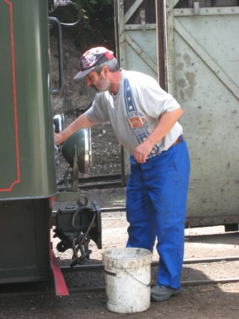 Réduction du souffleur, on est à 8 bars. Laurent va devoir faire avancer la machine de quelques tours de roue plus un demi-tour pour faire les niveaux des boîtes à huile dissimulées derrière l’embiellage. Vérification autour de la machine : rien ni personne devant-derrière-dessous-dessus. Purge des cylindres. Après le sauna finlandais, le hammam turc ! A quand le massage aux huiles essentielles. Coups de sifflets. Je pense avoir les tympans crevés. Finalement, pas complètement car j’entends encore Daniel parler à Laurent. .. Nouvelle responsabilité. Je dois desserrer puis resserrer le moment venu le frein du tender. Crans au maximum, régulateur demi-ouverture que notre mécano taquine doucement. La machine s’ébroue. Frein, régulateur à zéro, cran de marche à zéro. Tout en même temps. Deux tours de roue et demi, pile poil. Respect ! On graisse, il commence à faire sacrément chaud près de la virole de la chaudière.