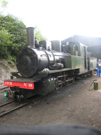 Pas possible le réfectoire doit être climatisé. Mais non, mais non ! Tout semble frais au sortir d’un autocuiseur. Petit repas sympa. Il y a là Daniel, son frère, et puis Laurent. S’y ajoutent un chef de train en titre, un chef de train en formation et ma femme qui nous a rejoins après une ballade dans les environs. Ah ! J’allais oublier le discret mais très sympathique conducteur du locotracteur qui écrit des articles dans la revue Voie étroite et qui va passer la journée dans son terrifiant engin (bruit, secousses, odeur de fioul) pour reprendre la rame voyageurs et la remonter sur le plateau.