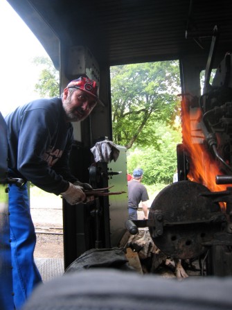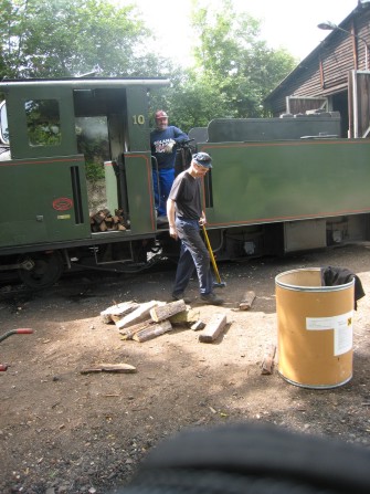 Laurent me demande si je sais comment fonctionne une locomotive à vapeur. Bien sûr que je sais. Donc il profite de l’inspection complète pour me présenter en détail la vénérable dame et ses dessous. Détail du fonctionnement des commandes et du poste de conduite. Première responsabilité… ramonage des tubes de fumée. Daniel, le chauffeur, va chercher le bois d’allumage. On mégote pas : ½ stère pour commencer. Je ne savais pas qu’ils avaient prévu de faire un méchoui pour 80 personnes. |