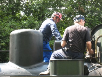 Vérification des boites à huile, niveaux, petit coup d’œil à l’embiellage. L’huile de surchauffe pour graisser les pistons est mise à tiédir sur le ciel du foyer car elle est épaisse comme du miel.