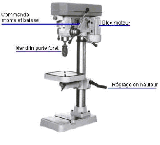 La perceuseC'est la machine-outil de base du mécanicien: la perceuse permet de forer dans le métal des trous parfaitement verticaux. L'outil coupant est appelé un foret. Le foret est réalisé dans un acier dur, ses arêtes de coupe sont meulées, et il a la forme d'une hélice pour évacuer les copeaux. On utilise des forets de différents diamètres, généralement de 2 à 20 mm pour les travaux courants. Bien-sûr, il existe dans l'industrie des perceuses beaucoup plus grosses et plus puissantes capables de forer jusqu'environ 100 mm. |