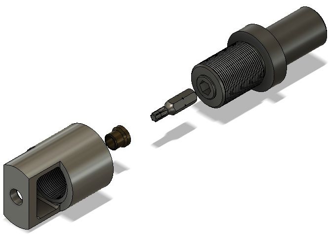 Lorsque le diamètre des vis augmente l’effort de coupe a tendance à entraîner la vis en rotation. Pour contrecarrer ce problème l’astuce proposée consiste à utiliser des embouts amovibles hexagonaux utilisés sur les visseuses. Le porte-embout avec l’empreinte hexagonale femelle est soudé à l’étain dans la partie mâle du mandrin. On peut aussi envisager un système anti-rotation de ce porte embout par rainure et vis.