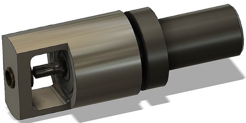 La vis est guidée par un canon de centrage et de maintien. On choisit du laiton afin de ne pas marquer le filetage de la vis. Ce canon est rapide à fabriquer sur mesure à chaque fois que nécessaire.